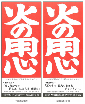 滋賀県消防協会甲賀広域支部(事務局:甲賀広域行政組合消防本部内)では、甲賀市及び湖南市内の小学校6年生を対象に、夏休みの宿題として「火の用心」に関する川柳を募集する「2021夏休みこども防火せんりゅう」を実施しました。