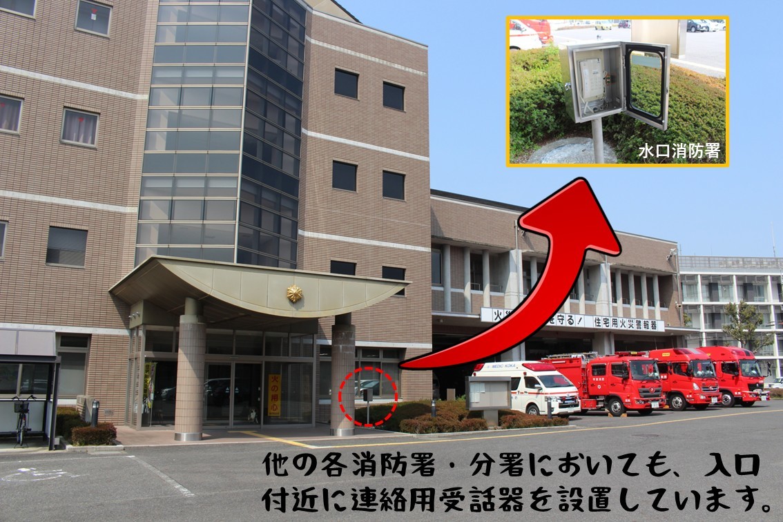 ・深夜間に来庁者された方は、各消防署・分署玄関付近に設置の連絡用受話器(駆込み通報装置)を取ることで対応させていただきます。